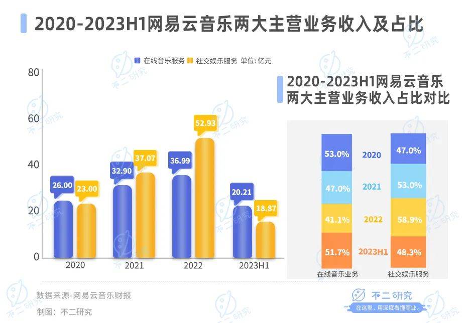 今年上半年,網(wǎng)易云音樂的在線音樂服務(wù)收入為20.21億元,社交娛樂服務(wù)及其他收入為18.87億元,分別占總收入的51.71%和48.29%。