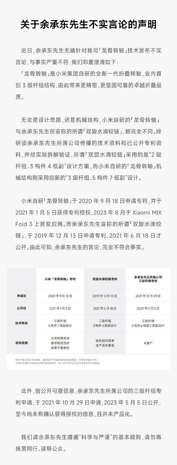 盡管這段表達并沒有指名道姓,但在宣傳上使用“龍骨”名詞的只有小米一家廠商。很快,小米官方賬號便在微博上激情開麥,回應了有關“龍骨轉軸”技術的質疑。