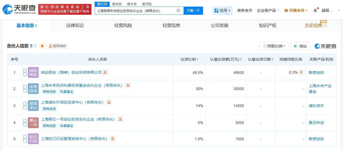 天眼查工商信息顯示,近日,上海聯想未來創業投資合伙企業(有限合伙)成立,執行事務合伙人為上海知己行遠管理咨詢中心(有限合伙),出資額10億人民幣,經營范圍為創業投資。合伙人信息顯示,該合伙企業由聯想旗下納遠明志(海南)創業投資有限公司、上海未來啟點私募投資基金合伙企業(有限合伙)、上海浦東引領區投資中心(有限合伙)等共同出資。