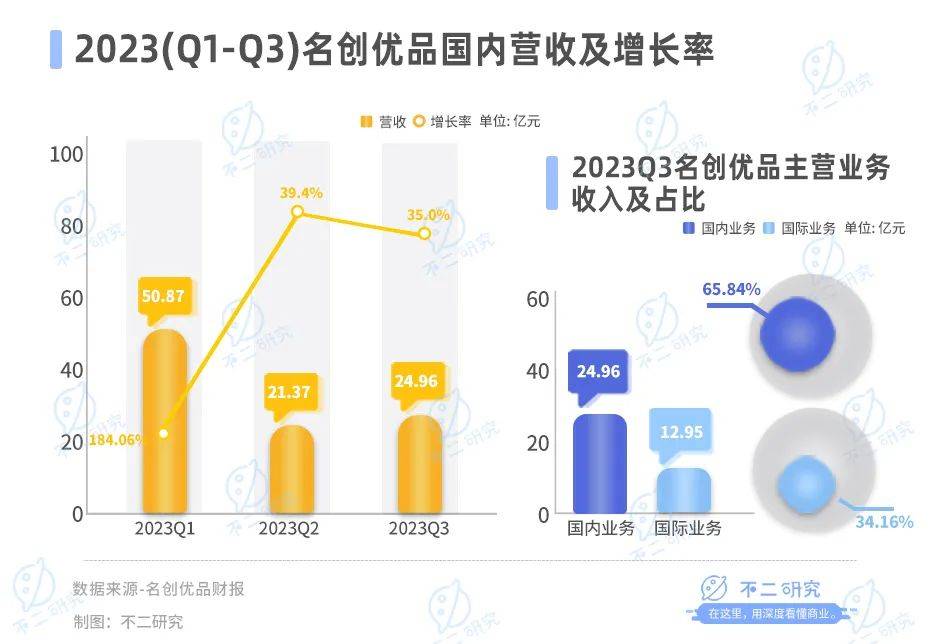 從營收結(jié)構(gòu)看,名創(chuàng)優(yōu)品2023年Q3國內(nèi)業(yè)務(wù)實現(xiàn)營收24.96億元,同比增長34.7%,占營收比例為65.84%;國際業(yè)務(wù)實現(xiàn)營收12.95億元,同比增長40.8%,占營收比例則為34.16%。