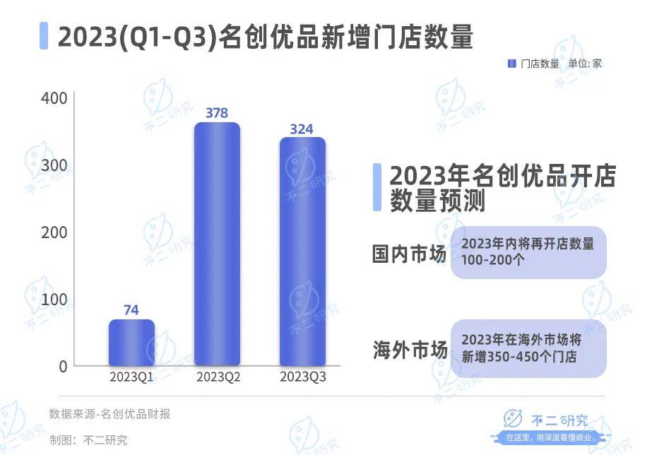 從開店速度看,2023年QI-Q3名創(chuàng)優(yōu)品分別新增門店74家,378家,324家,據(jù)名創(chuàng)優(yōu)品財報預(yù)測,其在2023年內(nèi)將再凈開100-200個新店;此外,名創(chuàng)優(yōu)品預(yù)計2023年在海外市場將新增350-450個門店。