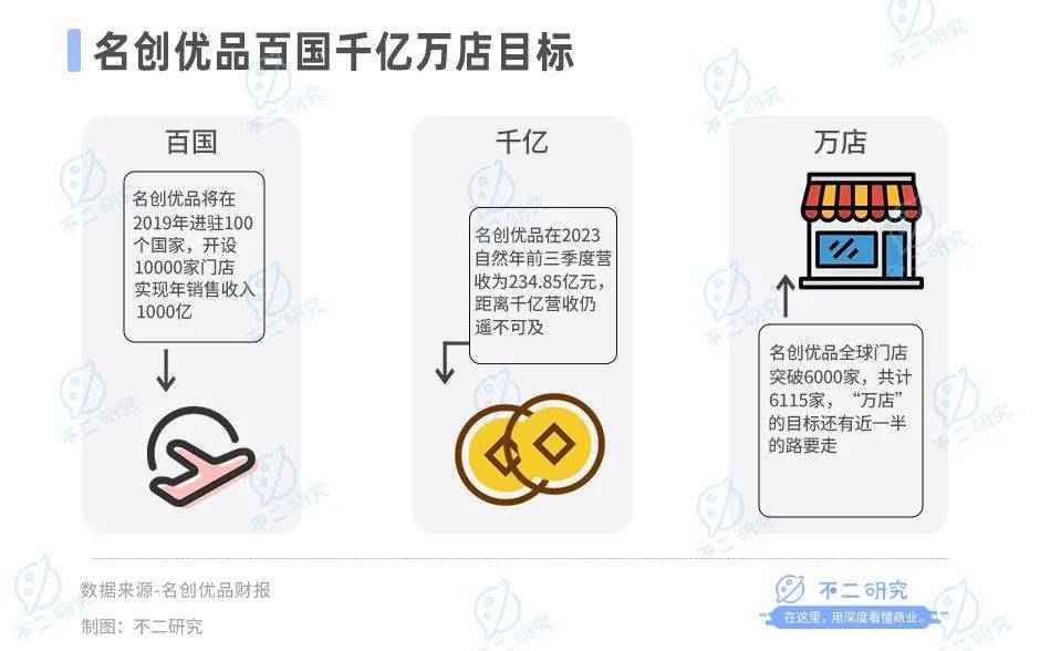 目前來看,名創(chuàng)優(yōu)品“百國千億萬店”計劃中唯一實現(xiàn)了的只有“百國”。離“千億萬店”這個目標還差不少,除非發(fā)生大爆發(fā),不然2023年名創(chuàng)優(yōu)品是不可能達成目標的。