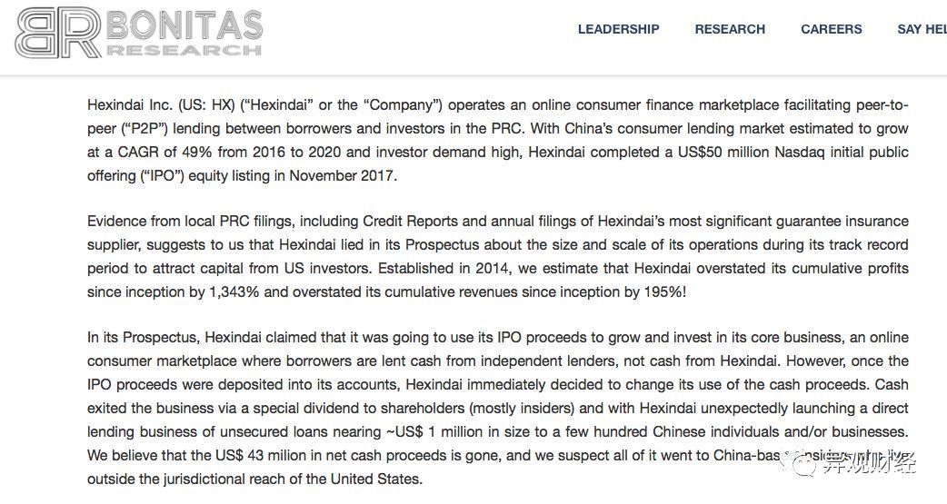 1月15日,做空機構Bonitas Research官網發(fā)布《和信貸=欺詐》報告,稱和信貸利用偽造的財務報表進行有預謀的欺詐行為,以便從美國投資者的口袋中掏取現金轉移到中國的內部人士手中。