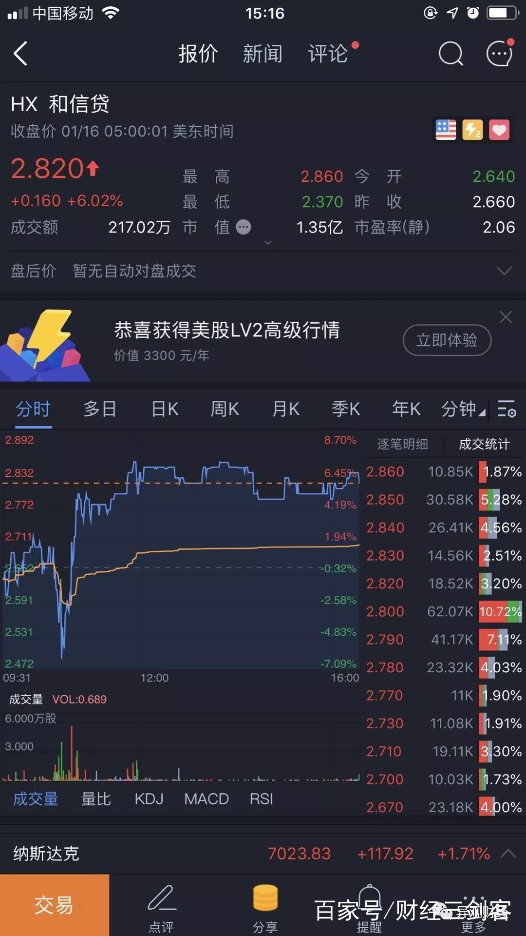 公開資料顯示,和信貸于2017年11月3日在納斯達克正式掛牌,上市首日股價一度達17美元。上市以來,和信貸的股價一路下跌,截至1月15日晚間美股收盤,股價為2.82美元。