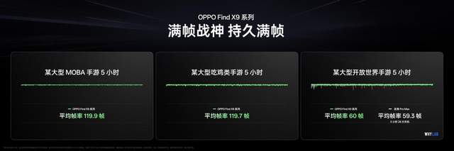 在主流 MOBA 手游中,Find X9系列輕松實現了最高幀率連續 5 小時滿幀運行,穩定無波動;即使是在第三方進行的大型開放世界手游測試中,Find X9系列仍可實現最高幀率 5 小時全滿幀運行,在復雜場景渲染、高頻技能釋放等場景下幀率始終穩定,為用戶帶來真正的“滿幀自由”。與之相比,其他最新發布的旗艦手機,全程幀率表現波動更大,且未達到4小時便電量耗盡關機。