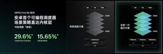 針對用戶高頻的游戲場景,傳統調度方案因內核層對應用場景認知不足,導致 SoC 執行大量冗余指令,游戲長時間運行易出現幀率波動。全新一代 OPPO 潮汐引擎搭載安卓首個可編程調度器,讓場景策略直達內核層,精準識別應用真實需求,為不同游戲場景定制高效調度方案,冗余指令執行至多減少 29.6%,同時大幅降低功耗至高 15.65% ,首次實現了游戲“持久滿幀”。