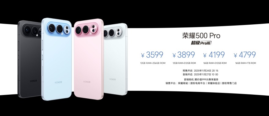 榮耀500系列共帶來“海藍(lán)寶”、“星光粉”、“月光銀”、“曜石黑”4款水晶配色,售價(jià)方面,榮耀500標(biāo)準(zhǔn)版12GB+256GB、12GB+512GB和16GB+512GB版本售價(jià)分別為2699元、2999元和3299元;榮耀500 Pro版12GB+256GB、12GB+512GB、16GB+512GB和16GB+1TB版本售價(jià)分別為3599元、3899元、4199元和4799元。現(xiàn)已在榮耀商城、授權(quán)電商平臺(tái)、榮耀體驗(yàn)店、授權(quán)零售門店開啟預(yù)售,并于11月27日10:00正式開售,首銷購(gòu)機(jī)贈(zèng)價(jià)值999元尊享服務(wù)。