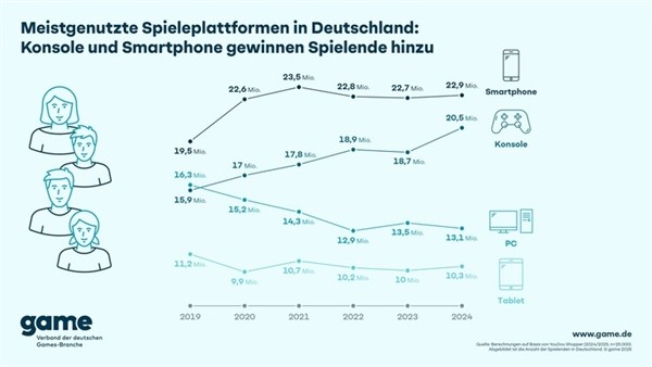 PC游戲玩家的數量正在下降,德國PC游戲玩家的數量從2019年的1590萬減少至2024年的1310萬,主機游戲的玩家數量卻在增加。