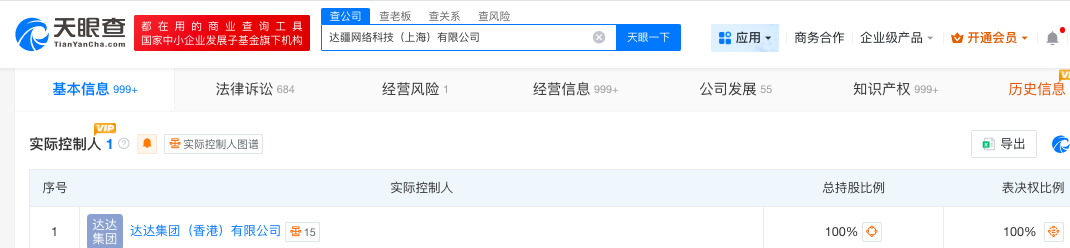 天眼查信息顯示,達(dá)疆網(wǎng)絡(luò)科技(上海)有限公司由達(dá)達(dá)集團(tuán)(香港)有限公司100%控股。