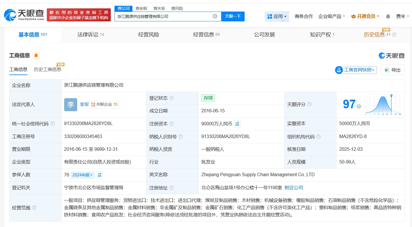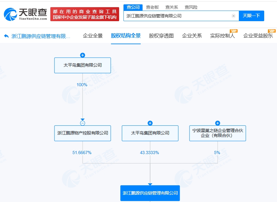 該公司成立于2016年6月,法定代表人為李軍,經營范圍包括供應鏈管理服務、貨物進出口、技術進出口、進出口代理等,現由太平鳥集團有限公司、浙江鵬源物產控股有限公司及上述新增股東共同持股。