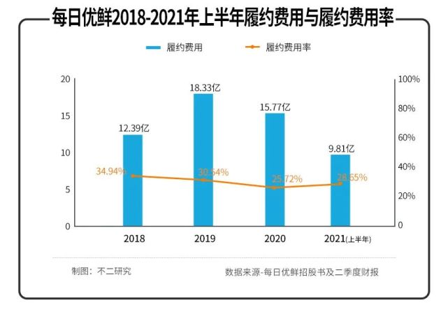 「不二研究」發(fā)現(xiàn),2018-2021年上半年,每日優(yōu)鮮累計(jì)虧損88.34億元;且履約費(fèi)用高企,其在上市后并未改變虧損換增長(zhǎng)的策略。