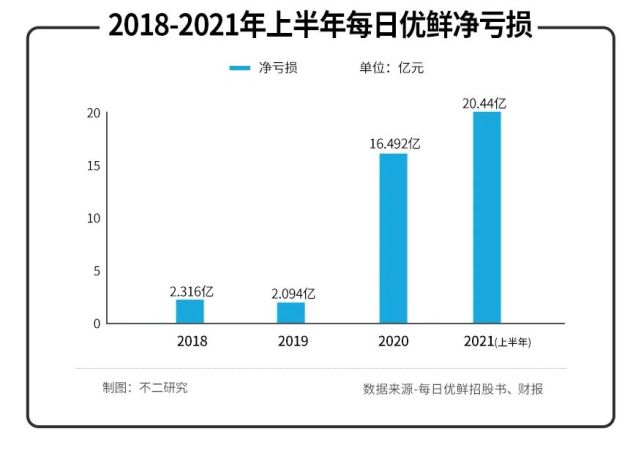 「不二研究」發(fā)現(xiàn),今年上半年,每日優(yōu)鮮的凈虧損已超過(guò)2020全年,較去年同期進(jìn)一步拉大15億元。