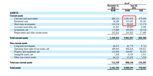 截至2021年6月30日,其現(xiàn)金及現(xiàn)金等價(jià)物、限制性現(xiàn)金和短期投資為34.273億元;在IPO前,截止2020年12月31日,這一數(shù)據(jù)僅為18.4億元。