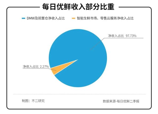 從收入貢獻(xiàn)來(lái)看,DMW及前置倉(cāng)仍是每日優(yōu)鮮的營(yíng)收主力,在今年上半年貢獻(xiàn)33.47億元,凈收入占比高達(dá)97.73%;而智能生鮮市場(chǎng)、零售云服務(wù)兩大業(yè)務(wù)合計(jì)收入僅數(shù)千萬(wàn),凈收入占比不足3%。