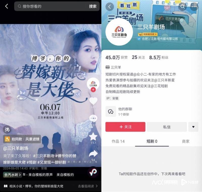 6月6日,小楊哥的公司“三只羊網絡”推出首部豎屏付費短劇《傅爺你的替嫁新娘是大佬》,全集42元;謙尋文化則成立了謙萌文化,近期,謙萌文化三部短劇《替身男友》《我家來了男保姆》《別跟弟弟談戀愛》的海報亮相。遙望科技在2023年四季度,將短劇平臺以微信小程序的方式上線。