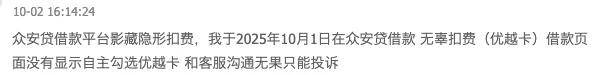 對于這個優悅卡,一名于2025年10月1日借款的借款人也直接指出,“眾安貸借款無辜扣費(優越卡),借款頁面沒有顯示自主勾選優越卡”。