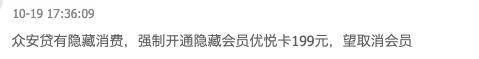 在黑貓投訴上,就有不少用戶反映,在借款后發現被莫名收取了會員費。一名用戶在10月19日稱,“眾安貸有隱藏消費,強制開通隱藏會員優悅卡199元,望取消會員。”