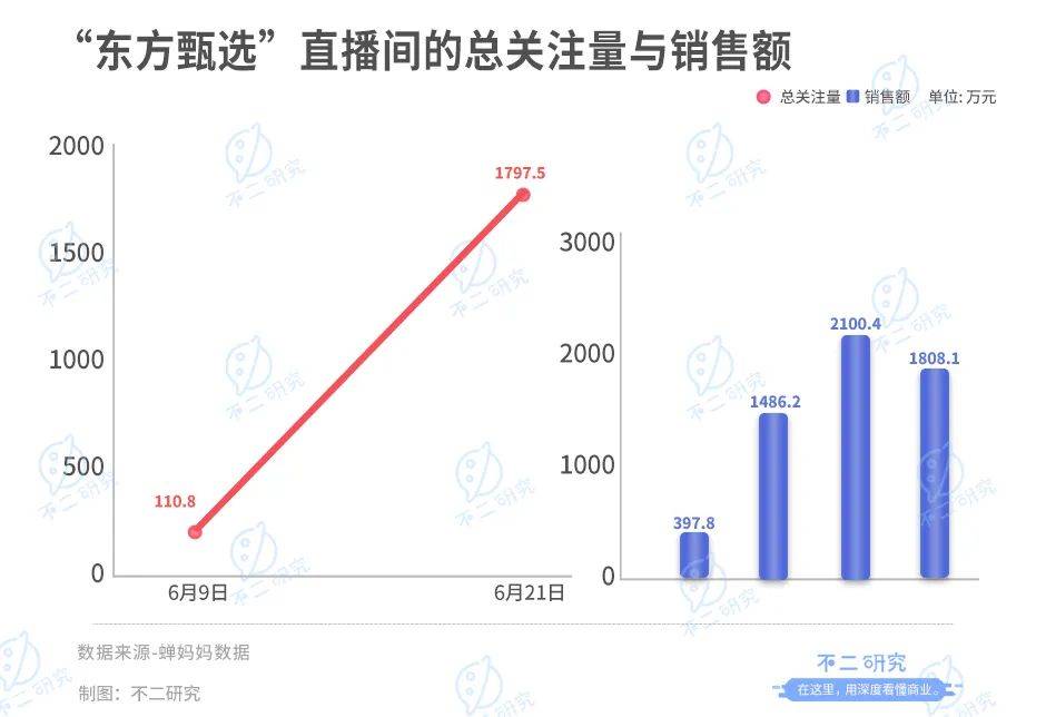 最新出圈的閃耀明星就是新東方的董宇輝老師,他的爆火讓“東方甄選”直播間的關注量完成逆襲。據蟬媽媽數據,“東方甄選”直播間的總關注量從6月9日的110.8萬,躍升至6月21日1797.5萬,不到兩周翻了16倍有余