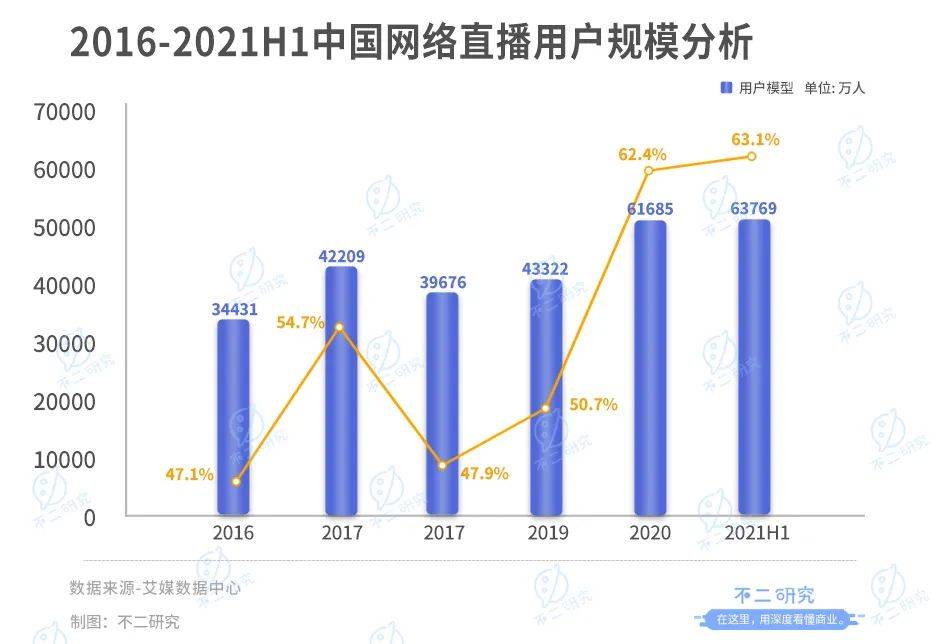 艾媒數據顯示,截至2021年6月,我國網絡直播用戶規模達6.38億,與2020年同期相比增長47.2%,占網民整體的63.1%。