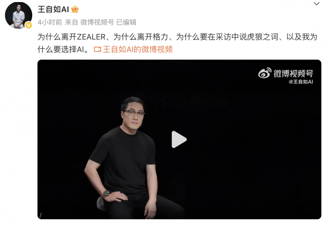 在視頻結尾,王自如宣布自己重回創業者身份,選擇AI賽道。