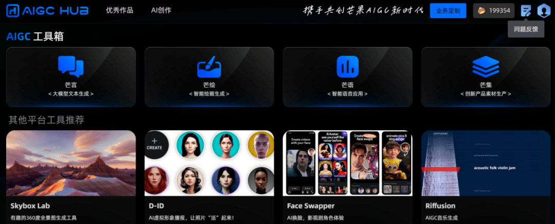AIGC HUB集成了領域模型、AI繪畫、語音生成等文本、圖像、語音模態的AIGC能力。根據芒果TV官方的說法,希望通過“全民”共建、“全民”共用的方式將AIGC的能力浸潤到內容生產、互動運營、宣傳推廣、廣告營銷等生產細節中,期望通過大規模深入的應用激發各業務場景的創新創意,攜手共創芒果AIGC新時代。
