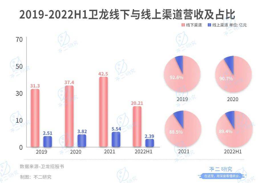 2019-2022上半年,衛(wèi)龍線下渠道收入分別為31.34億、37.39億和42.46億和20.21億,營收占比高達92.6%、90.7%、88.5%、89.4%。