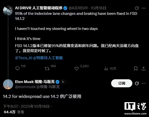 IT之家注意到,馬斯克的這一表態是對特斯拉車主、長期 FSD 測試者 AI DRIVR 所發布內容的回應,AI DRIVR 指出,是時候向整個車隊推送 FSD 功能了,因為 FSD V14.1.2 版本已經變得非常成熟。