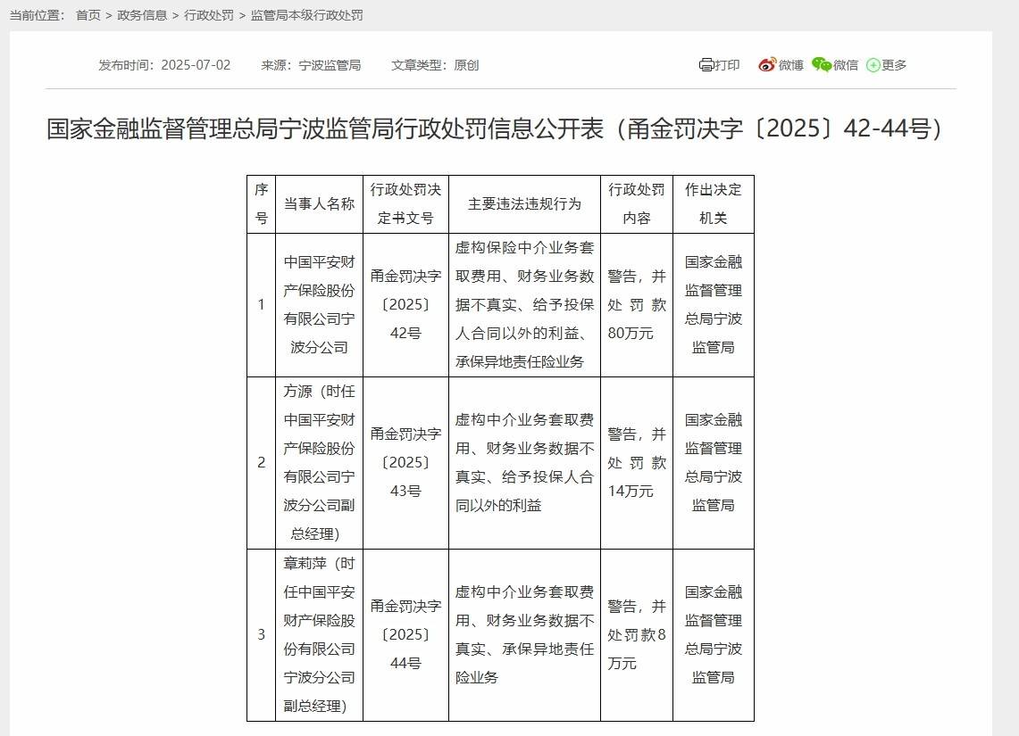 2025年7月2日,據“甬金罰決字〔2025〕42號”的行政處罰文書顯示,平安產險寧波分公司因“虛構保險中介業務套取費用、財務業務數據不真實、給予投保人合同以外的利益、承保異地責任險業務”等問題,國家金融監督管理總局寧波監管局對其作出警告,并處罰款80萬元的行政處罰決定。