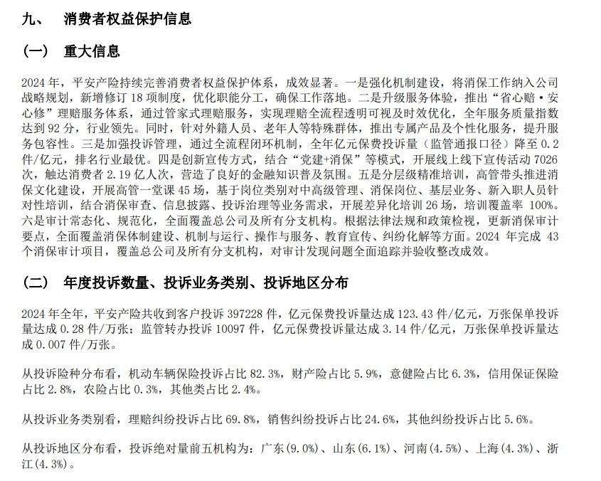 如果說行政處罰是監管對平安產險合規問題的直接打擊,那么客戶投訴則是市場對其服務質量的間接否定。天眼查App顯示,根據平安產險2024年度信息披露報告,全年共收到客戶投訴397228件,其中由監管部門轉辦的投訴就達10097件。億元保費投訴量高達123.43件/億元,遠超行業平均水平。