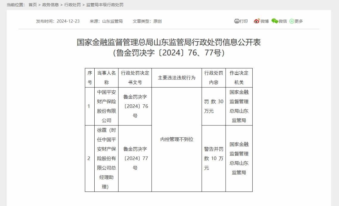 與此同時,“魯金罰決字〔2024〕77號”行政處罰決定書顯示,徐某(時任中國平安財產保險股份有限公司總經理助理)因“內控管理不到位”,國家金融監督管理總局山東監管局對其作出警告并罰款10萬元的行政處罰決定。