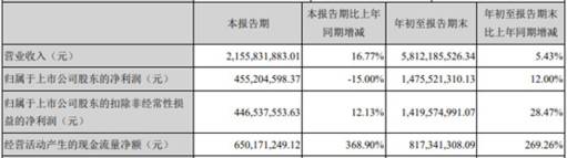 不過,單看第三季度業績表現,就沒那么靚麗了。財報顯示,第三季度營業收入為22億元,同比增長16.8%,歸母凈利潤為4.55億元,同比下降15.00%,扣非凈利潤4.47億元,同比增長12.13%