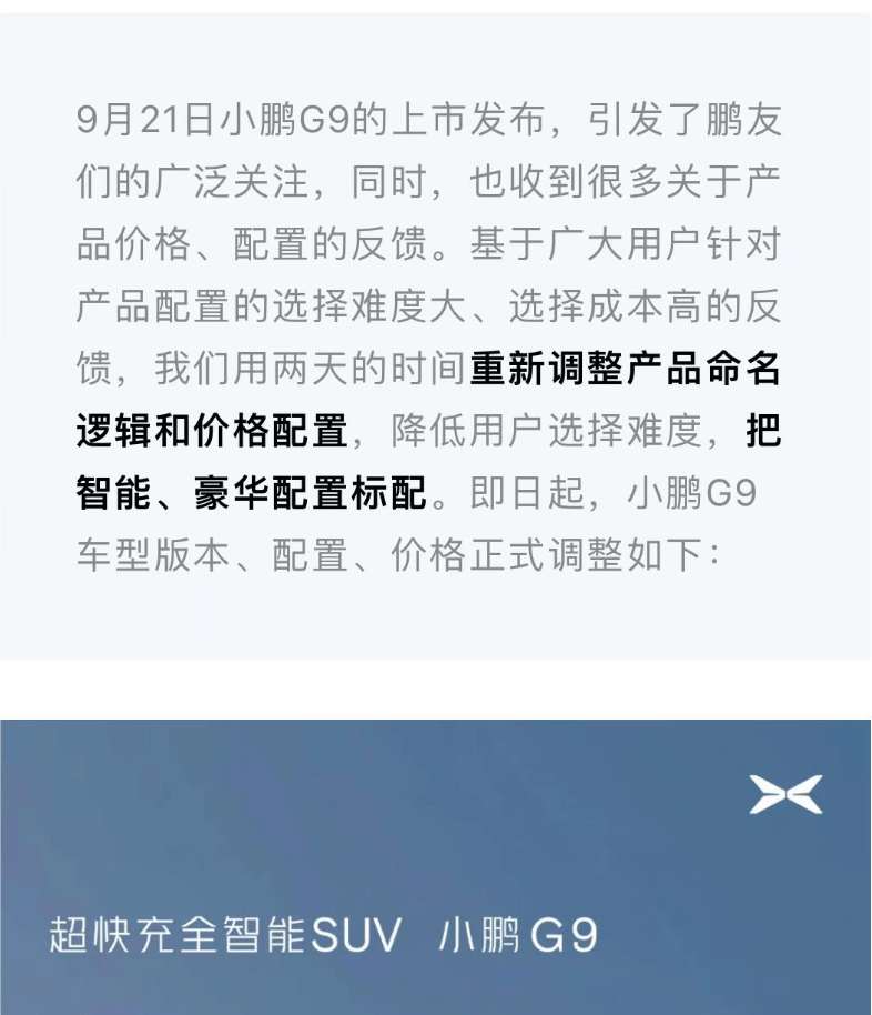 然而,正在過彎的小鵬近期遇到了各種問題。小鵬G9一上市就遭遇了危機,作為小鵬的第四款量產車型,G9擔著小鵬沖擊高端、提升毛利的重任,卻因為混亂的配置受到內外質疑,最終導致新車剛發布2天就大改配置單和價格的罕見場面。