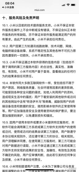 而在小米金融“用戶協議”里發現,小米對類似情況產生不良后果的責任早就撇的一清二楚,“不承擔任何責任”。