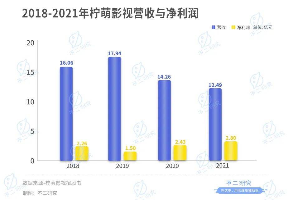 「不二研究」發現,檸萌影業的經營數據并不穩定。招股書數據顯示,2018~2021年,檸萌影業營業收入分別為16.06億、17.94億、14.26億和12.49億元,其經調整后的凈利潤分別為2.26億、1.50億、2.43億、2.80億元。