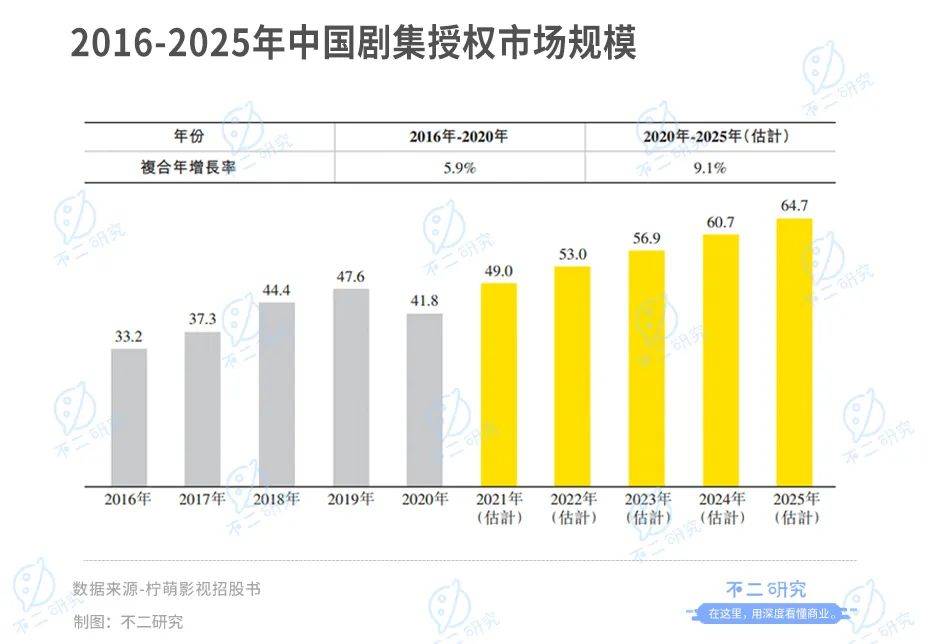 據弗若斯特沙利文,2020年國內劇集授權市場規模為418億元,預計2025年將達到647億元,復合年增長率為9.1%。