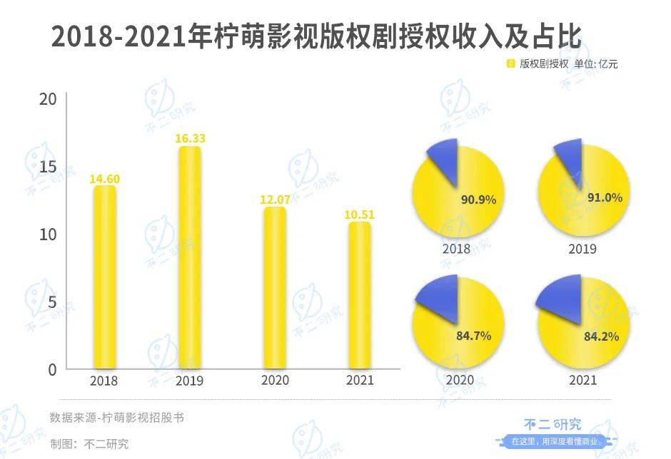 檸萌影業的收入結構較為單一,版權劇授權貢獻了絕大多數營收。根據招股書,2018~2021年,檸萌影業版權劇授權收入分別為14.60億、16.33億、12.07億和10.51億元,占總營業收入的90.9%、91.0%、84.7%及84.2%。