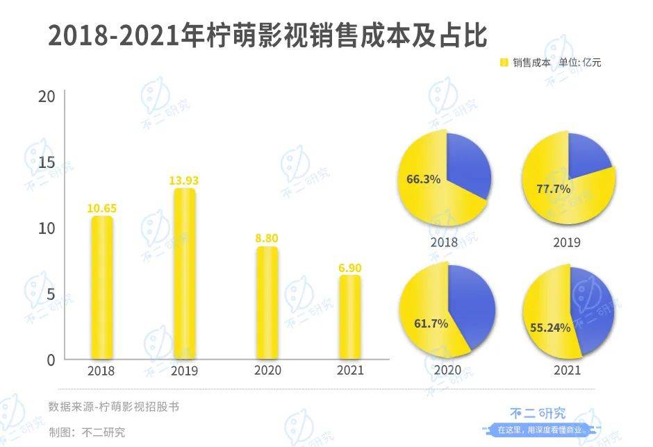 招股書顯示,2018~2021年,檸萌影業的銷售成本分別為10.65億、13.93億、8.80億、及6.90億元,總收入占比66.3%、77.7%、61.7%及55.24%。