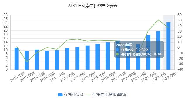 自從2021年因“國潮”崛起紅利之后,李寧的業(yè)績很快就出現(xiàn)了高光消退的逆轉(zhuǎn),渠道庫存開始明顯積壓。2022年,李寧的存貨24.28億元,同比大幅增長36.96%,到了2023年中期,存貨依然有21.2億元,環(huán)比只減少了12.7%,在加大了促銷力度后依然沒有消化多少庫存。