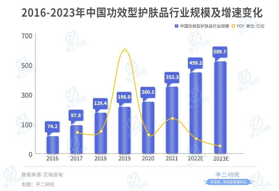 歐睿國際顯示,2022年我國皮膚學級護膚品(功能性護膚)市場規模達到285.9億元,同比增長6.8%。根據艾瑞咨詢,未來三年功能型護膚市場規模將以29.4%的年均復合增速繼續增高,并于2023年達到589.7億元。