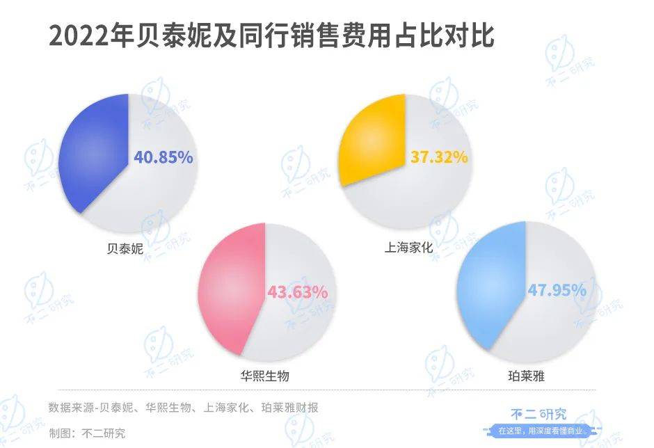 財報顯示,貝泰妮銷售費用率常年高于40%。2018年-2022年,貝泰妮銷售費用分別為5.03億元、8.43億元、11.07億元、16.81億元和20.48億元,均高于凈利潤水平;銷售費用占營收比重分別為40.52%、43.39%、41.99%、41.79%和40.85%。