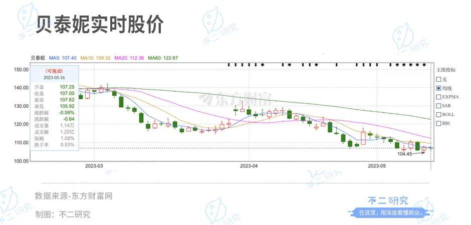 3月30日,貝泰妮年報公布后的首個交易日,其股價上漲5.61%。截止5月16日收盤,貝泰妮股價報107.00元/股,對應市值453.3億元。對比2021年的市值高點,貝泰妮當前股價已近乎腰斬,市值蒸發超700億元。