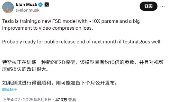 馬斯克透露特斯拉FSD新模型進展:參數(shù)增至十倍,最快下月底發(fā)布快訊