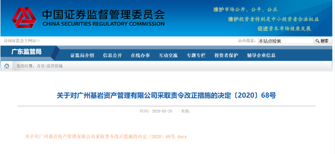 基巖資管在520這一天收到了廣東證監(jiān)局責(zé)令其整改的處罰決定書。