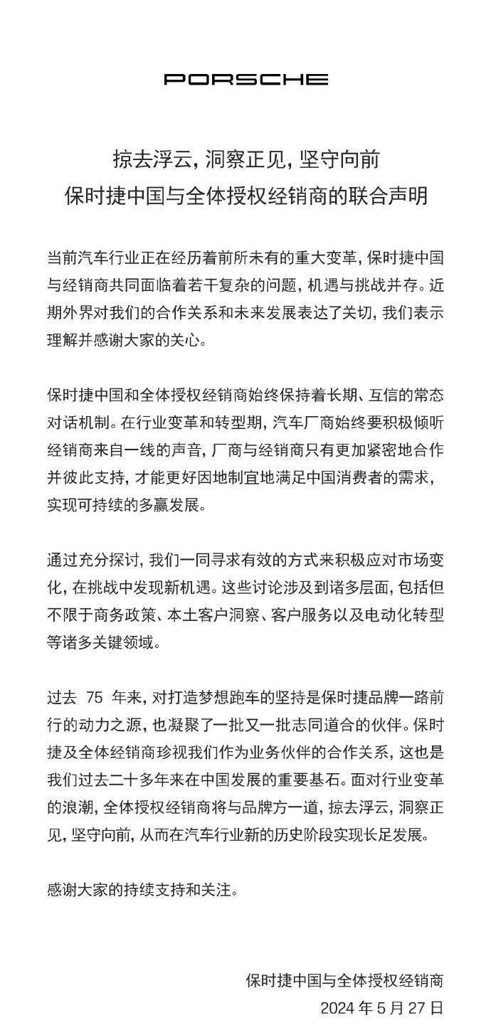 到這里為止,此事看似圓滿解決了。但不知道保時捷的經銷商是如何看待這份聯合聲明的,畢竟除了場面話之外,既沒有提出解決方案,也沒有應對市場的措施。在握手言歡的表象之下,“保時捷在中國賣不動”這一本質問題,其實還沒有得到解決。