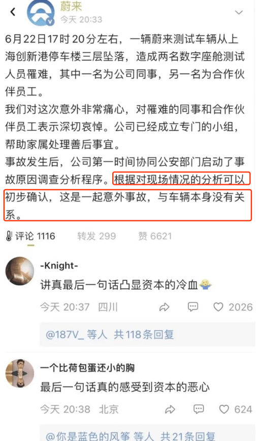 事故致使兩名試車員身故。在事件發生后,蔚來汽車第一時間發布聲明稱,但聲明卻遭到了極大的質疑。
