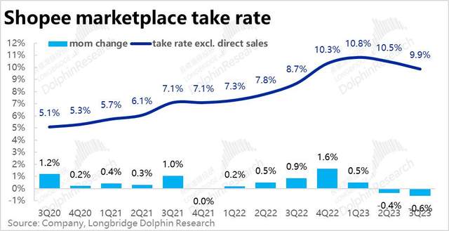 另外也能看到,Shopee先前為了做利潤不顧代價的大幅拉高變現率,現在為了增速,近兩個季度又再度接連下調了變現率(分別環比下降0.4%和0.6%),為了實現經營目標,“一根筋式”的上調再下調變現率,海豚君認為一定程度上顯示了管理層經營時的嚴重短視,為了當期的KPI,而不顧背后的代價。