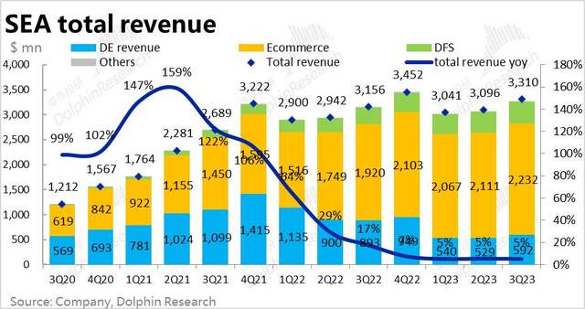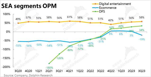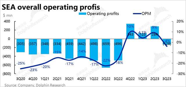 具體來看,最關鍵的電商板塊本季經營虧損高達4.3億美元,和去年三季度5.9億的虧損,已屬同一量級,近乎過去幾個季度扭虧的功績一筆勾銷。雖然公司為了推動Shopee業務量止跌回升,投入和虧損擴大可以理解。但在GMV和收入提速并不算驚喜的情況下,Shopee虧損幅度卻遠差于市場預期(約1億的經營利潤),著實難以原諒。