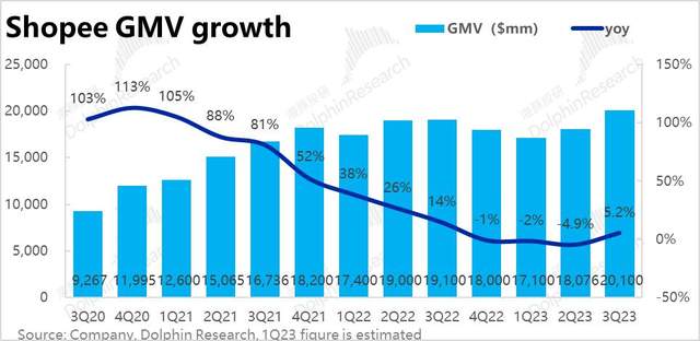 具體來看,本季Shopee實現20.1億美元的GMV規模,在先前連續三個季度負增長后,終于扭正到5%的同比正增長。