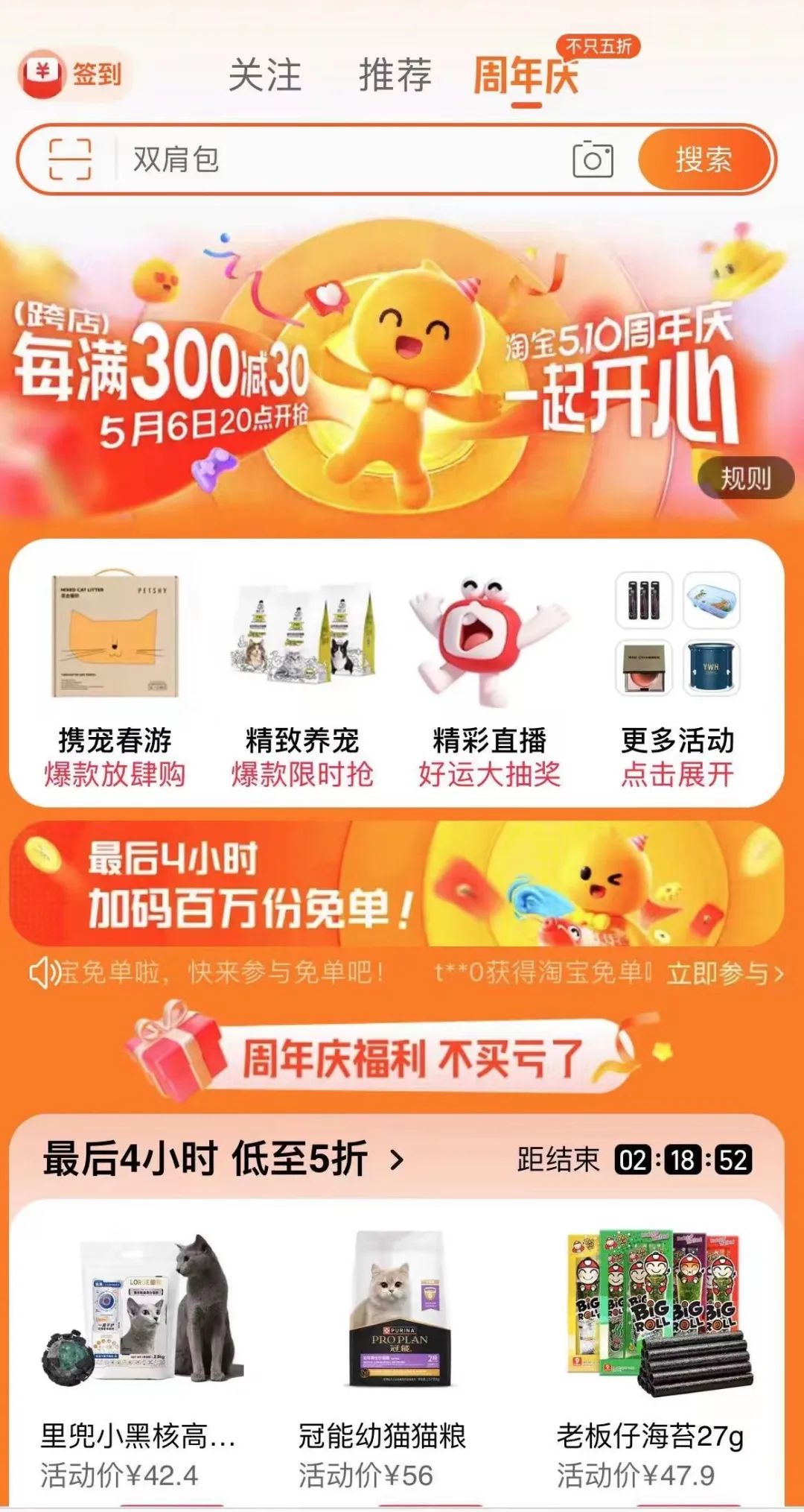 5月6日,大量淘寶用戶突然被大規(guī)模免單,此前官方并未發(fā)布任何活動(dòng)玩法和游戲規(guī)則,隨后官方宣布,淘寶周年慶開啟了答題免單活動(dòng),據(jù)悉,活動(dòng)周期內(nèi)預(yù)計(jì)將發(fā)放100萬(wàn)個(gè)免 單名額。加上五一、母親節(jié)等各種節(jié)日促點(diǎn),今年上半年的淘天似乎一直在“打折”。