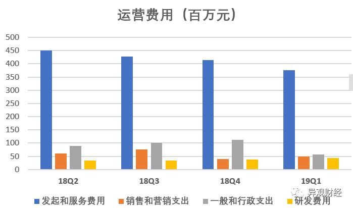 其中,發起和服務費用、一般和行政支出費用出現不同程度的收縮,市場和銷售費用、研發費用支出環比增幅較大。